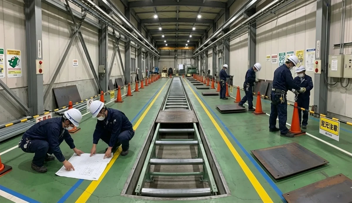 工場などで使われる機械設備を、所定の位置に正しく、そして安全に設置します。生産ラインの品質や安全性に直結する重要な作業で、ミリ単位の精度が求められるため、単に置くだけでなく、測量から行います。主に自動車メーカーのコンベヤーレールや、大型倉庫の電動式移動ラックなどを据え付けています。